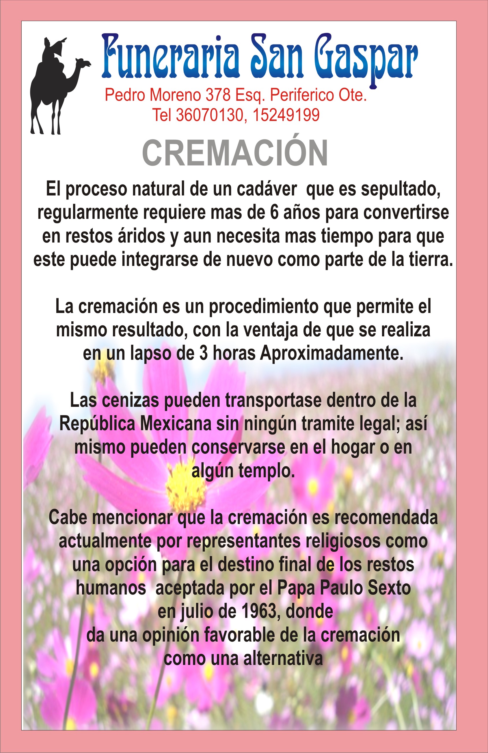 * Asesoría y gestoría para certificado de defunción, acta de defunción así como derecho de cremación.